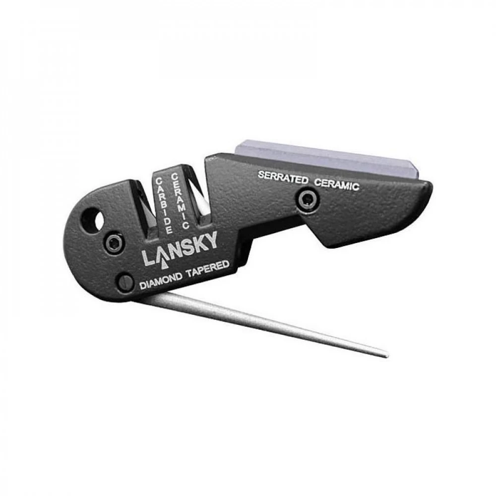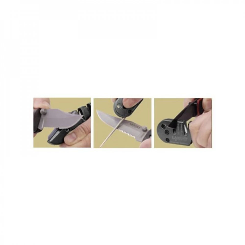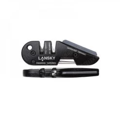 Le Blademedic de Lansky est un affûteur et aiguiseur 4 en 1 : il remet à neuf n’importe quelle lame de n’importe quel couteau. Il combine un affûteur en carbure de tungstène (si lame très usée), une pierre d’affûtage en céramique (si lame dentée), un affûteur en céramique (pour un aiguisage normal) et une tige d’affûtage en diamant (pour la finition). Taille : 10 cm. Poids : 93 grammes.