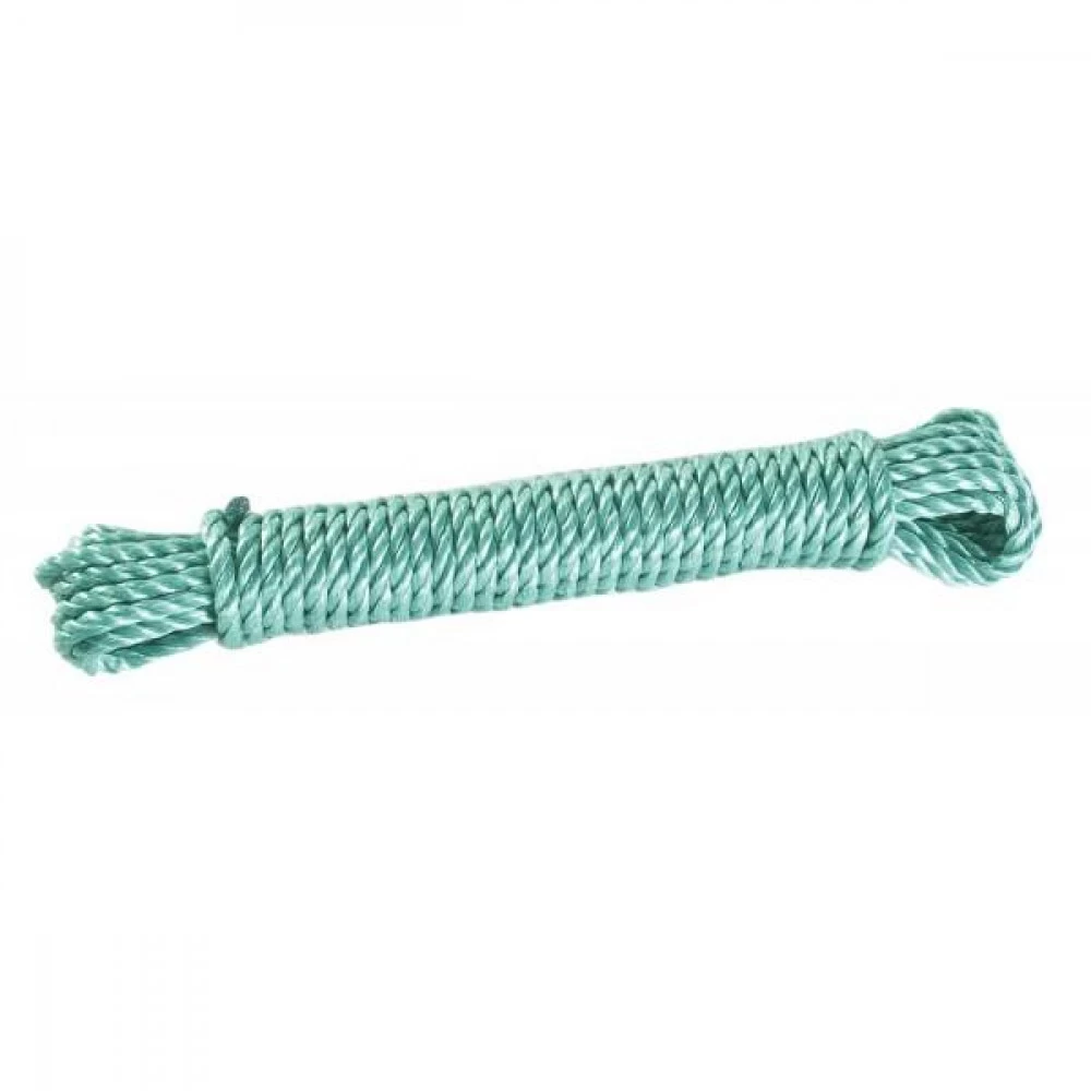 – Longueur : 10 mètres- Diamètre : 6 mm- Matériau : polypropylène traité anti UV- Coloris : vert- Résistance : environ 500 kg/F (= charge maximale d’utilisation)