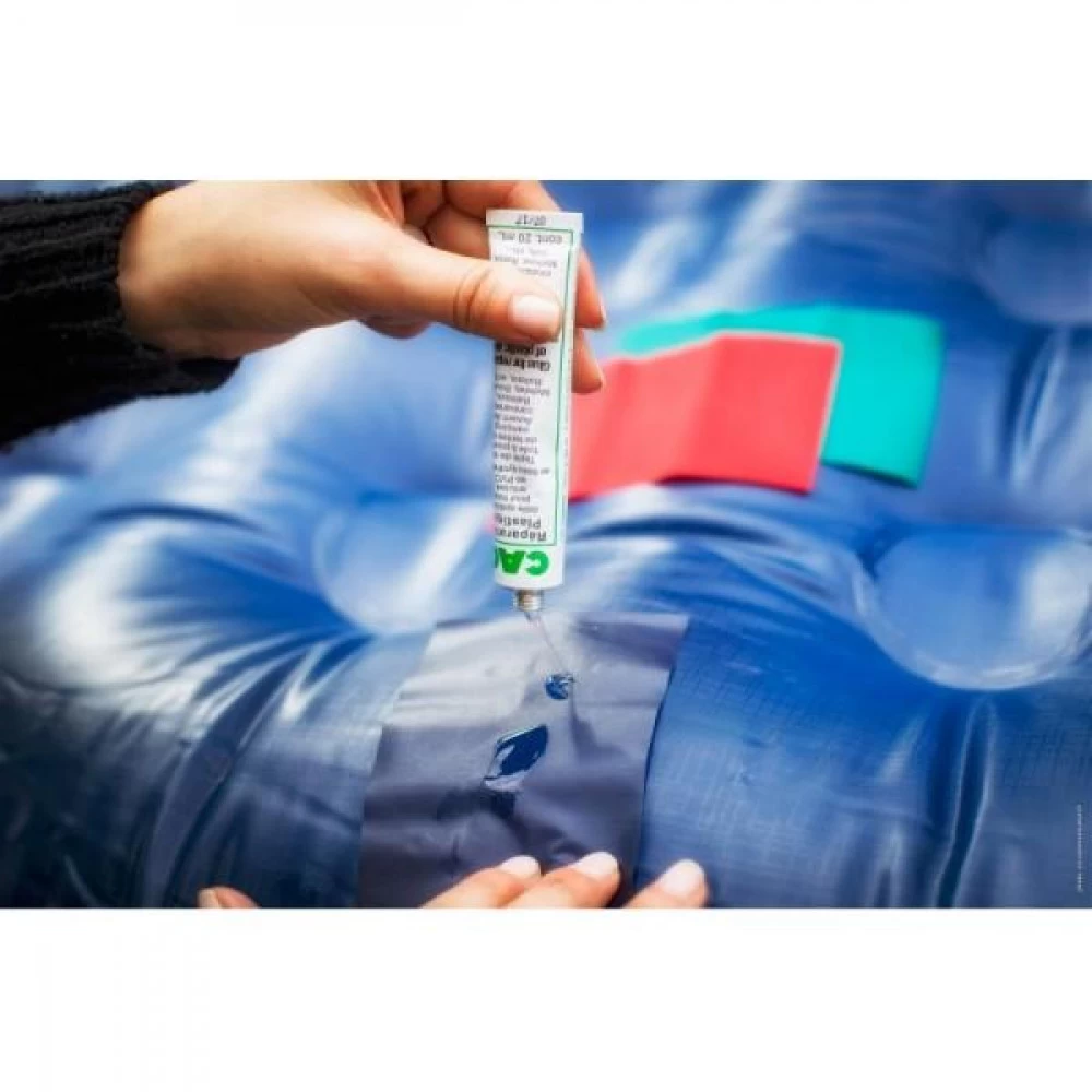 Kit de réparation CAO OUTDOOR avec colle et pièces de tissu pour toile enduite et caoutchouc au camping ou en randonnée.