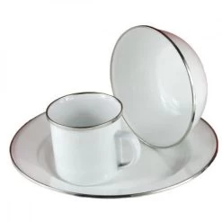 – Poids : 510 g- Matériau : tôle émaillée – Coloris : blanc- Assiette : H 2,6 – ø 24 cm – Bol : H 5 – ø 15 cm – Tasse : H 8 – ø 9 cm