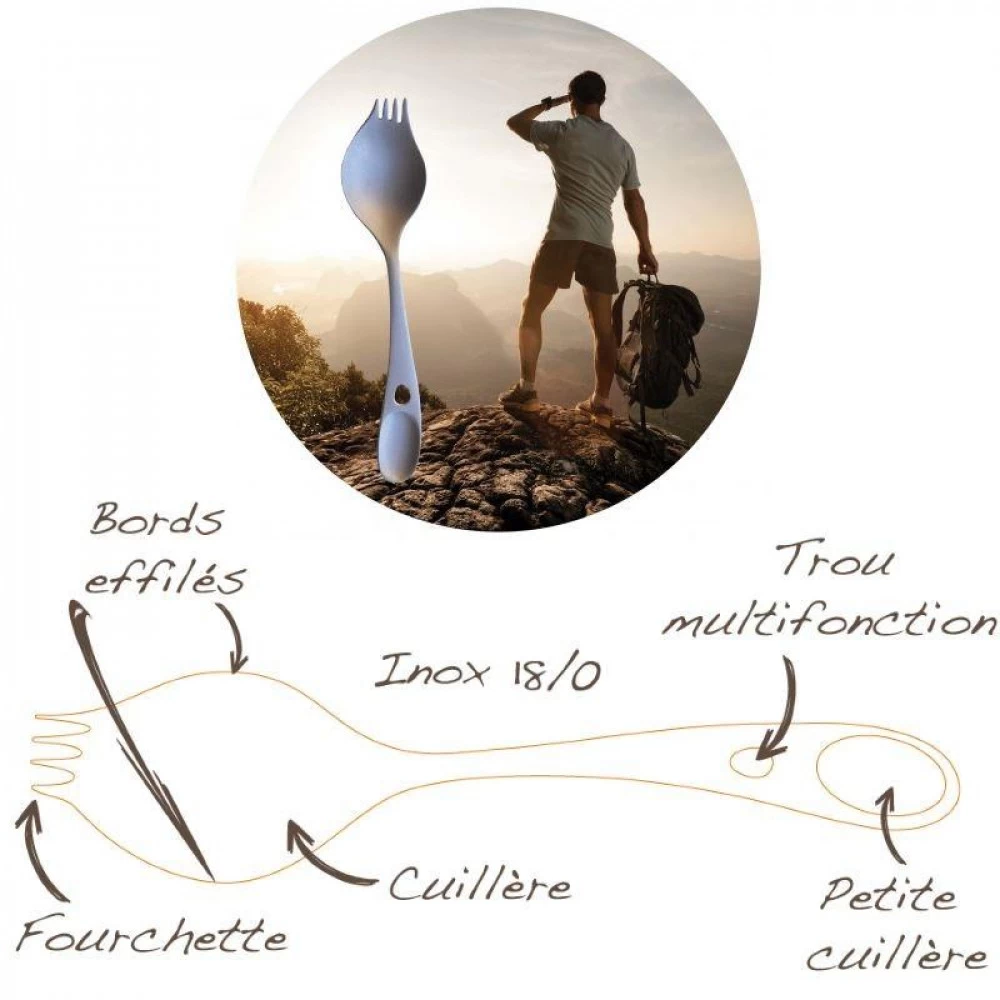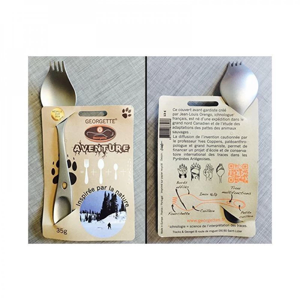 MĂ©daille d’or au concours LĂ©pine 2016, le couvert multifonction Georgette Aventure est le couvert de randonnĂ©e et couvert de camping par excellence. A lui seul, ce couvert regroupe une fourchette, une cuillĂšre Ă soupe, une cuillĂšre Ă cafĂ©, un couteau sĂ©parateur d’aliments et un trou multitĂąche. Georgette Aventure pĂšse 35 g et mesure 16 cm : gain de poids et d’espace dans votre sac. MatiĂšre : inox.