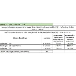 Lampe rechargeable par dynamo ou (8h) par énergie solaire (5,5V/20mA).