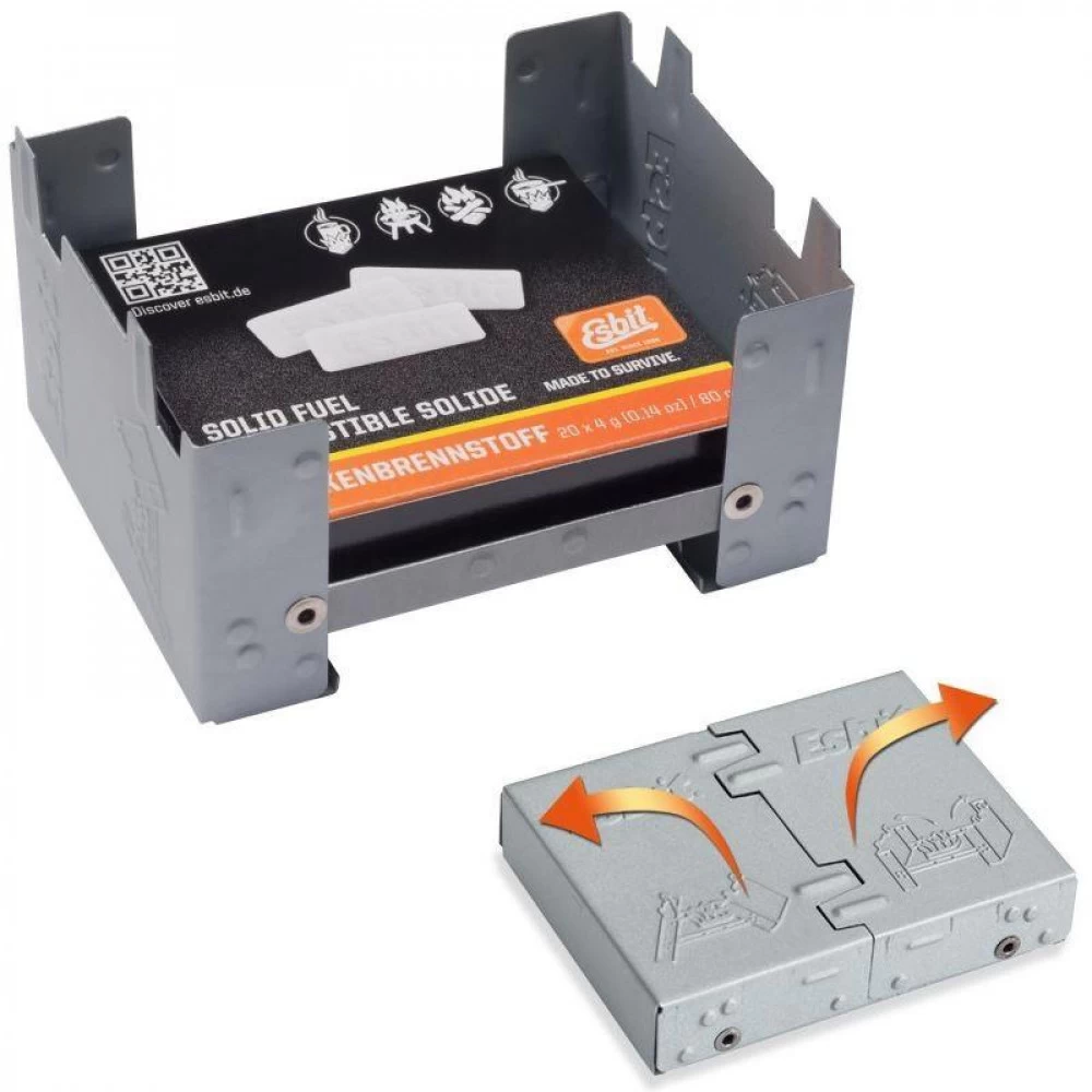 Pliable, métallique, spécialement conçu pour la randonnée, le camping et la survie, le réchaud Rando Esbit (référence : 3211) fonctionne via des tablettes à combustion lente. Avantages : le réchaud Esbit fonctionne sans gaz et affiche un format ultra-compact : 98 mm de long par 75 mm de large et 20 mm d’épaisseur, une fois plié. Remarque : 20 tablettes sont fournies avec le réchaud.