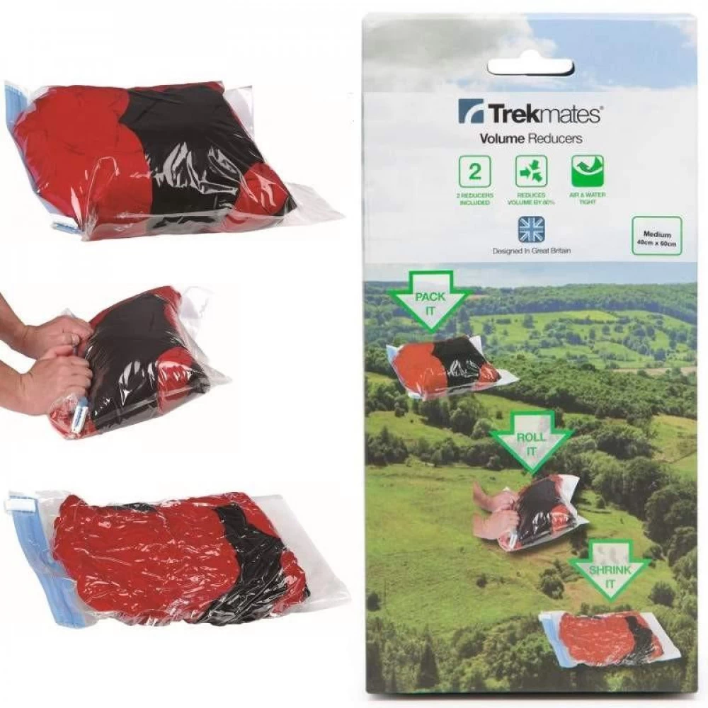 VĂ©ritable sac de compression, le produit Trekmates Volume Reducers permet de gagner un espace considĂ©rable dans votre sac de voyage ou votre sac de randonnĂ©e. Il est vendu par lot de 2. Rangez, protĂ©gez et compressez facilement vos affaires par vide d’air : gagnez 80 % d’espace. VidĂ© et pliĂ©, le Volume Reducers de Trekmates est trĂšs compact. Taille : 50 x 70 cm. Poids total : 95 grammes.
